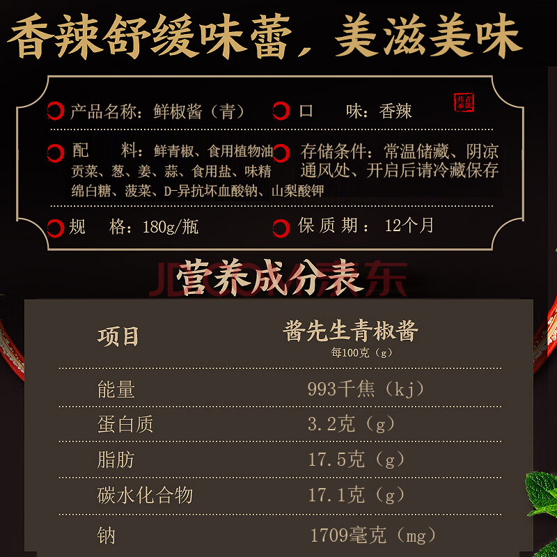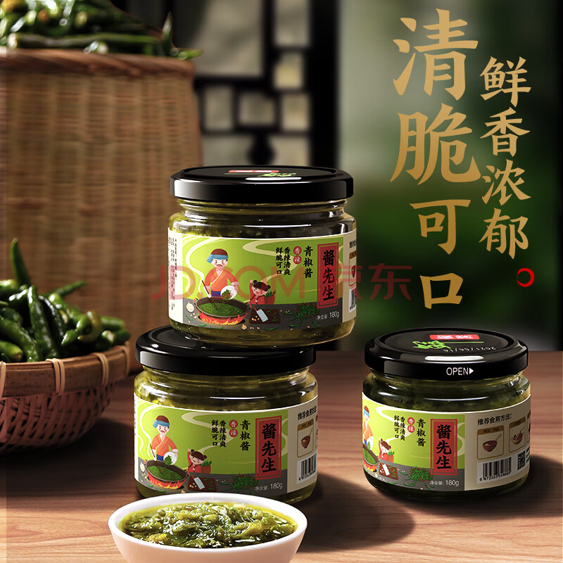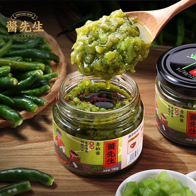商品相册:酱先生青椒酱180g 农家手工爽脆香辣下饭菜剁椒拌饭拌面辣椒酱第
