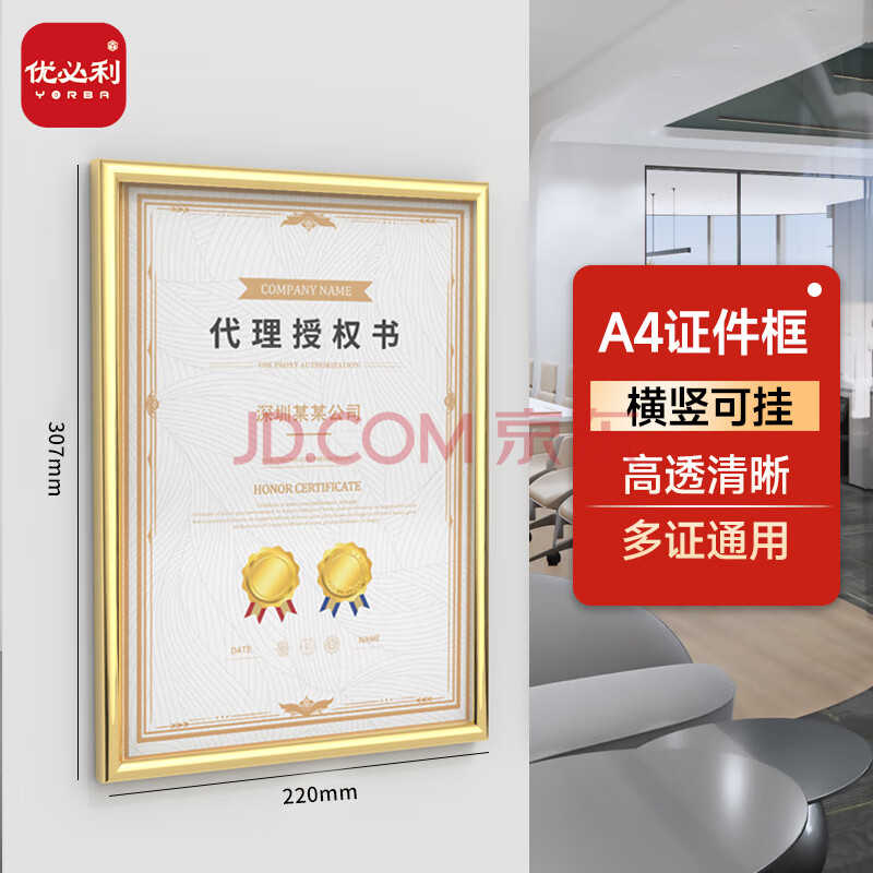 商品相册:优必利 A4证件框 相框 塑料证书框画框 A4营业执照框 工商税务登记证框 横竖证件框 金色5064A第1张/共7