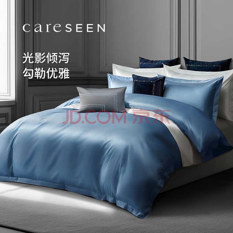 商品相册:康尔馨五星级酒店床品A类60支纯棉贡缎简约四件套全棉被套 蓝色1.5米床第