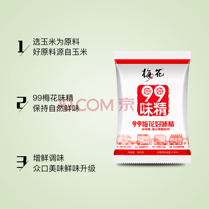 商品相册:梅花99味精 玉米提炼99% 提味增鲜调味料 大包装1kg/袋第