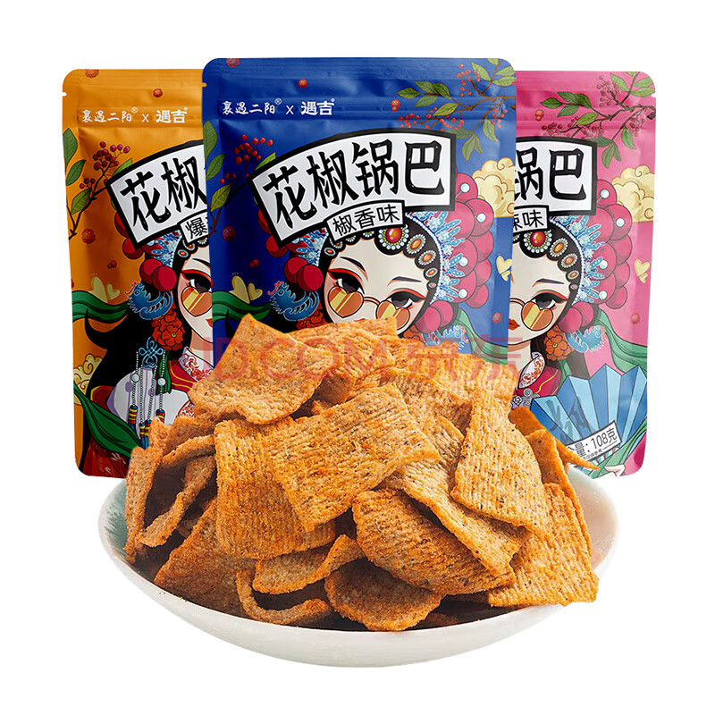 商品相册:襄遇二陽襄遇二阳手工花椒锅巴108g*3口味组合 休闲膨化零食小吃锅巴第