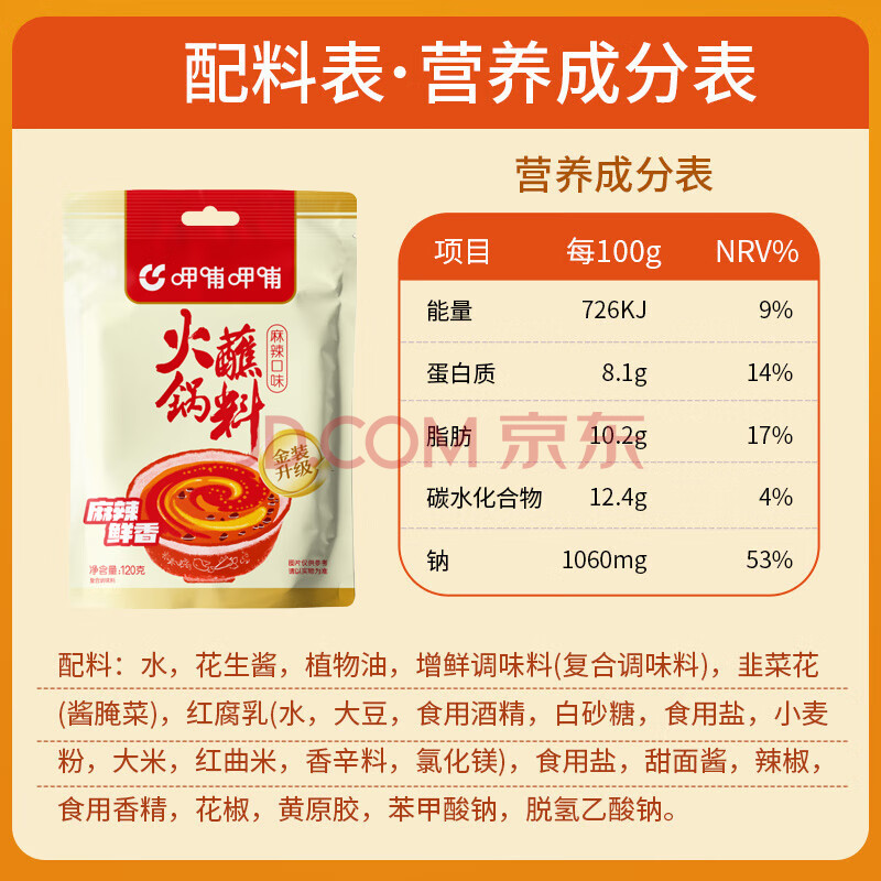 商品相册:呷哺呷哺 麻辣味火锅蘸料 花生酱 中辣麻酱拌面拌饭酱 火锅食材120g*2袋第