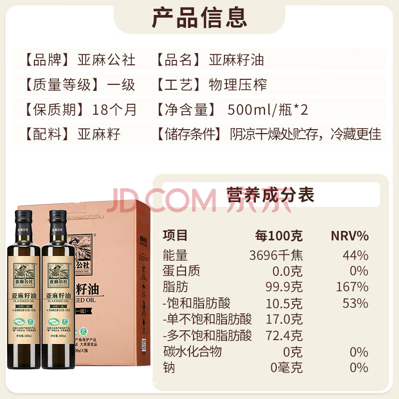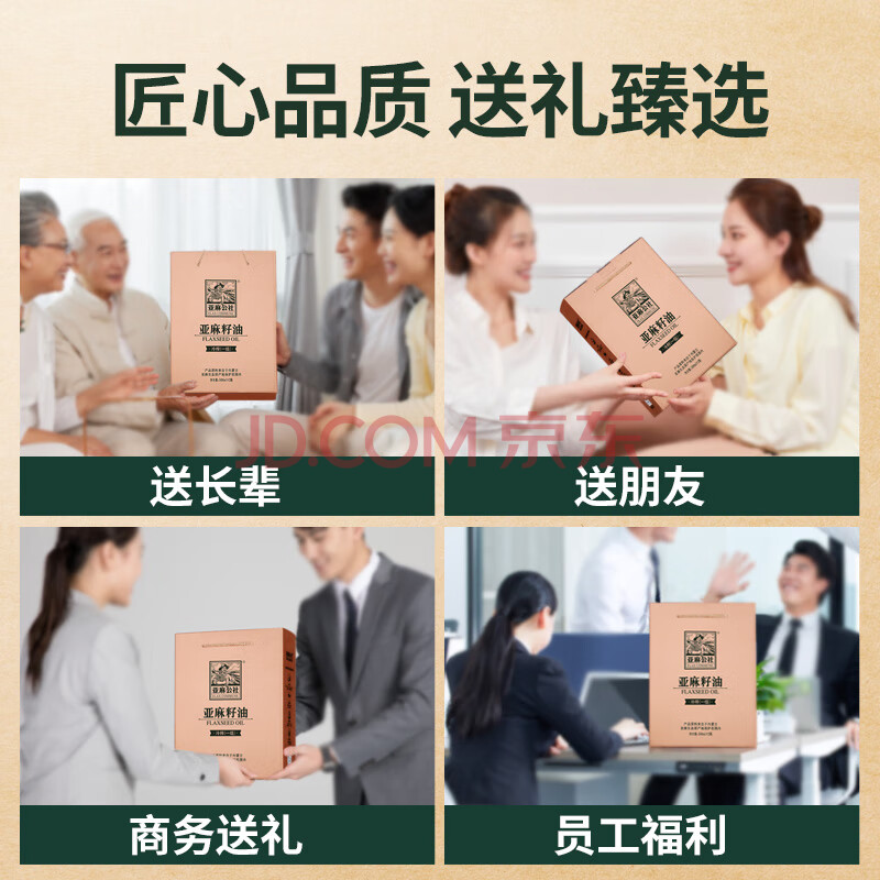 商品相册:亚麻公社亚麻籽油礼盒500ml*2瓶 口服直饮冷榨一级胡麻油内蒙特产节日礼品第