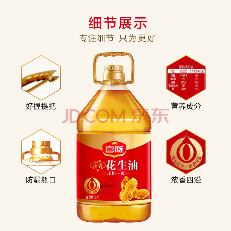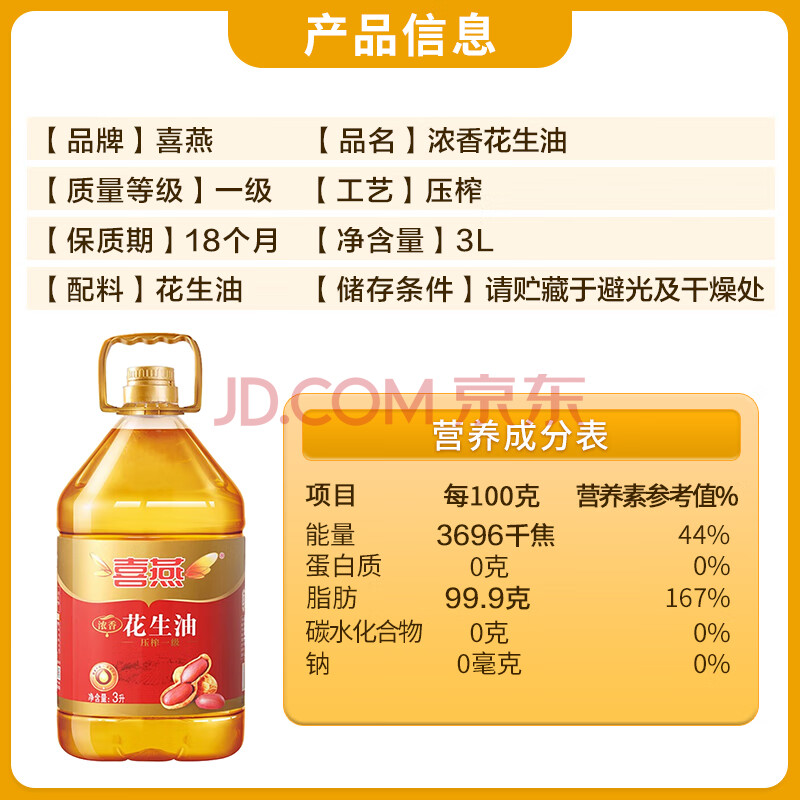 商品相册:喜燕浓香花生油物理压榨一级食用油3L山东产粮油植物油第