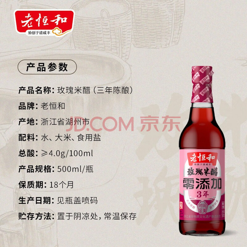 商品相册:老恒和 玫瑰米醋500ml【三年陈酿】凉拌饺子老陈醋 纯粮酿造香醋调味醋第
