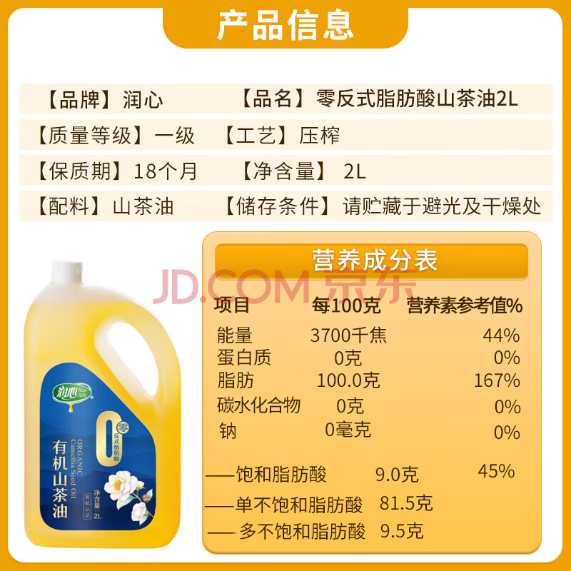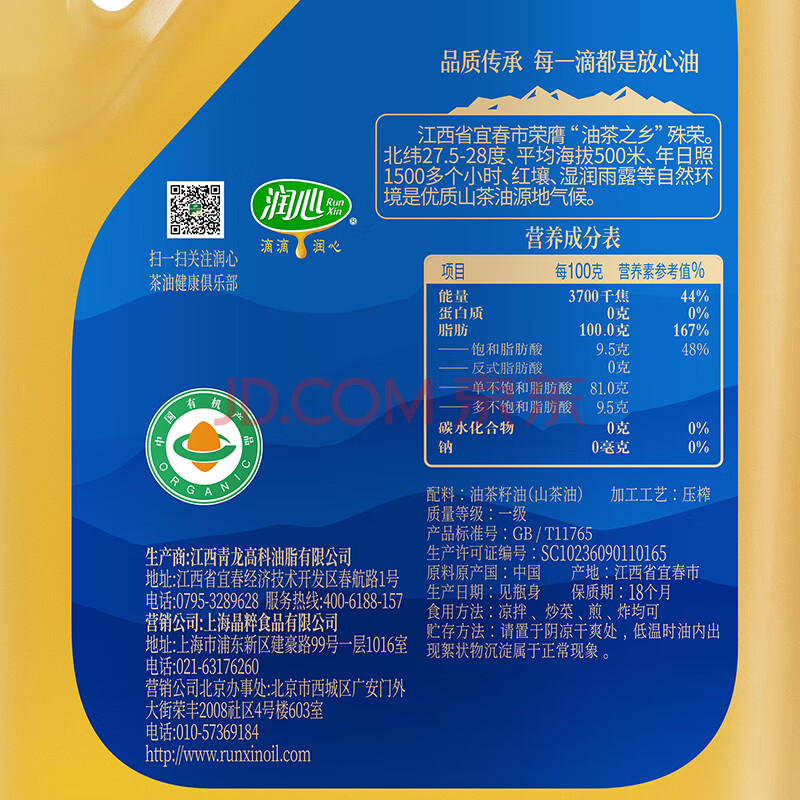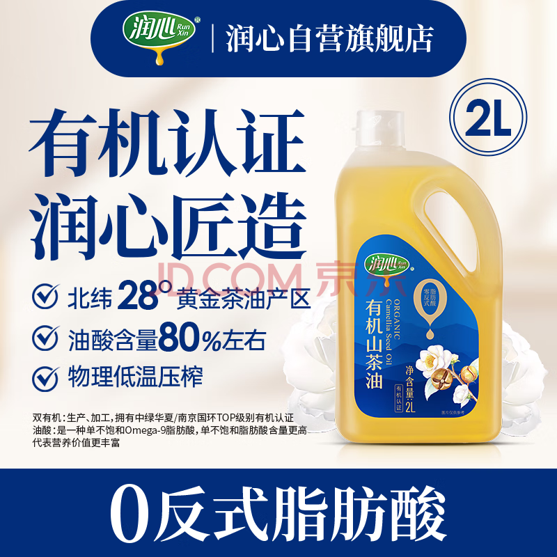 商品相册:润心【保真山茶油】 有机山茶油 低温冷榨一级 零反式脂肪酸山茶油*2L第
