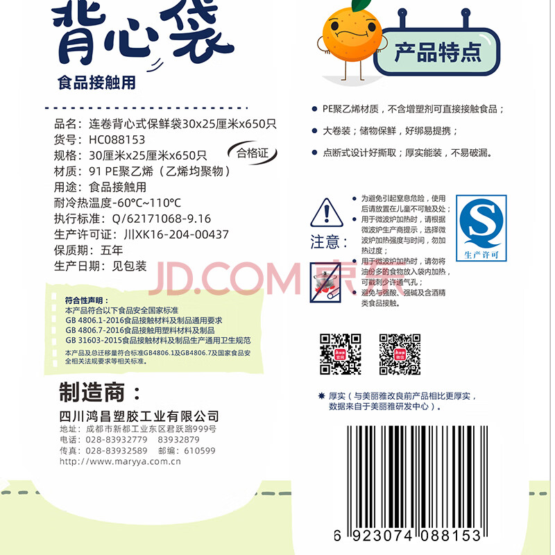 商品相册:美丽雅一次性连卷背心式保鲜袋30*25厘米650只 食品级增厚耐用分装袋子第