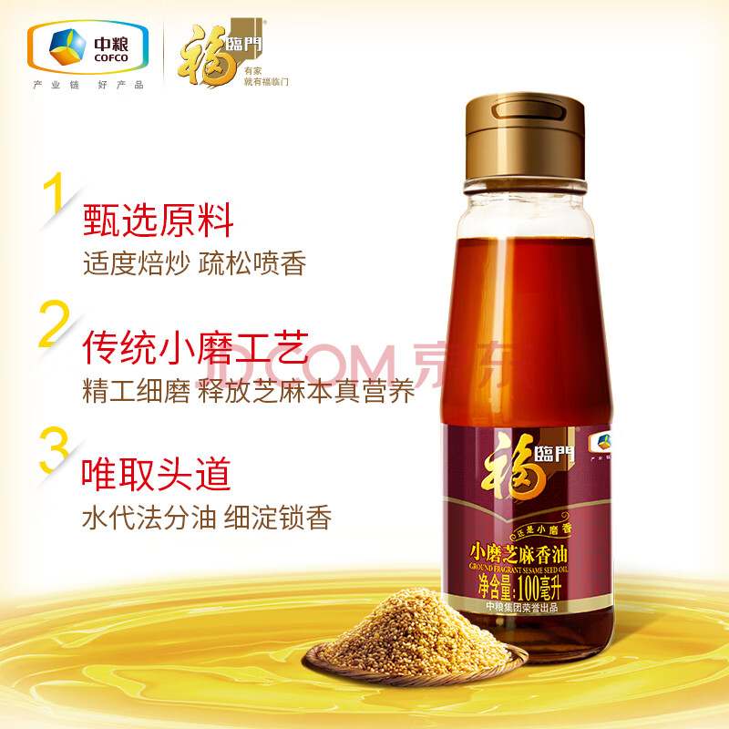 商品相册:福临门 食用油 一级小磨香油100ml 纯芝麻油 凉拌调味烹饪火锅 中粮出品第