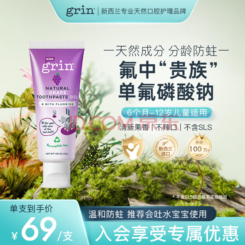 商品相册:grin儿童牙膏含氟防蛀3-6-12岁宝宝婴幼儿青少年牙膏45g葡萄味第