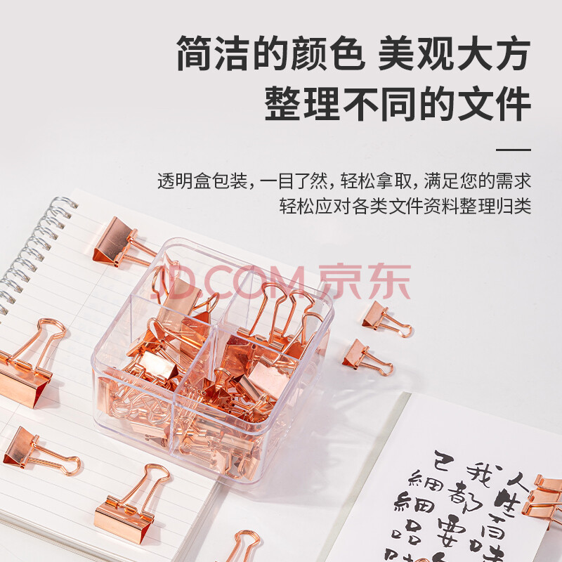 商品相册:得力(deli)78205玫瑰金金属长尾夹票夹办公用票据夹燕尾夹文件夹 多规格大中小混装组合套装 44只/盒 1盒装第