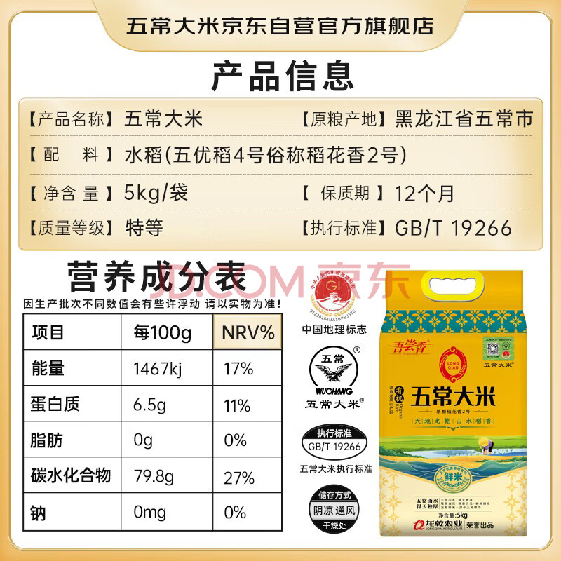 商品相册:五常大米官方溯源 吾尝香 特等五常大米 10斤 原粮稻花香2号 有机 新米第