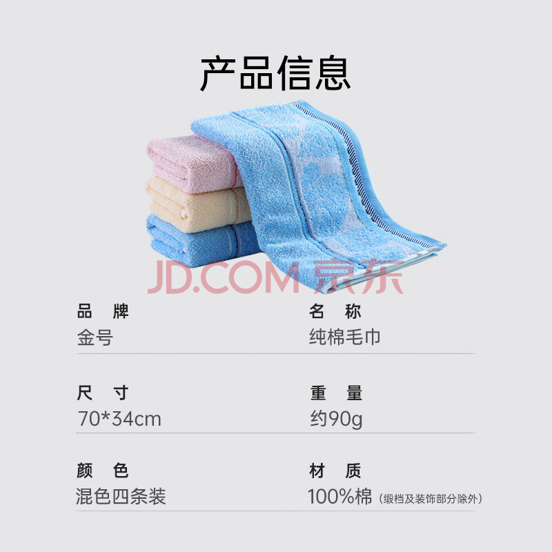 商品相册:金号毛巾家纺 4条装 AAA级抗菌柔软吸水纯棉洗脸毛巾70*34cm 混色第