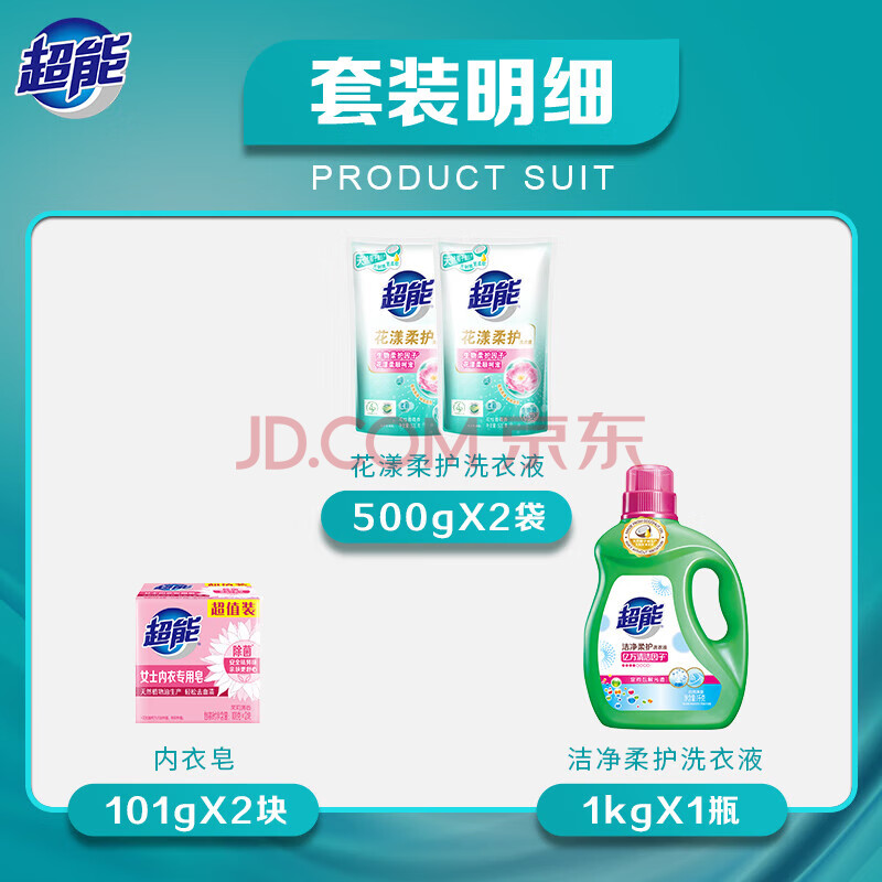 商品相册:超能 洁净柔护洗衣液1kg+500g*2袋超能植翠低泡洗衣液(柔顺舒适)非单卖品+超能内衣皂101*2第