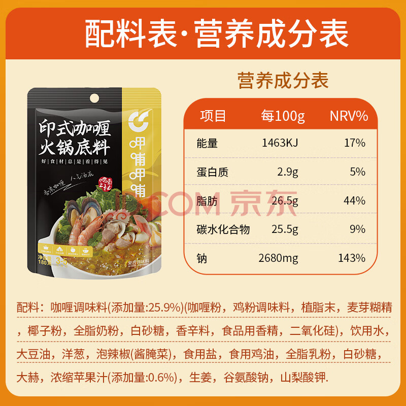 商品相册:呷哺呷哺印式咖喱火锅底料 麻辣烫冒菜调味料 咖喱味火锅食材180g第