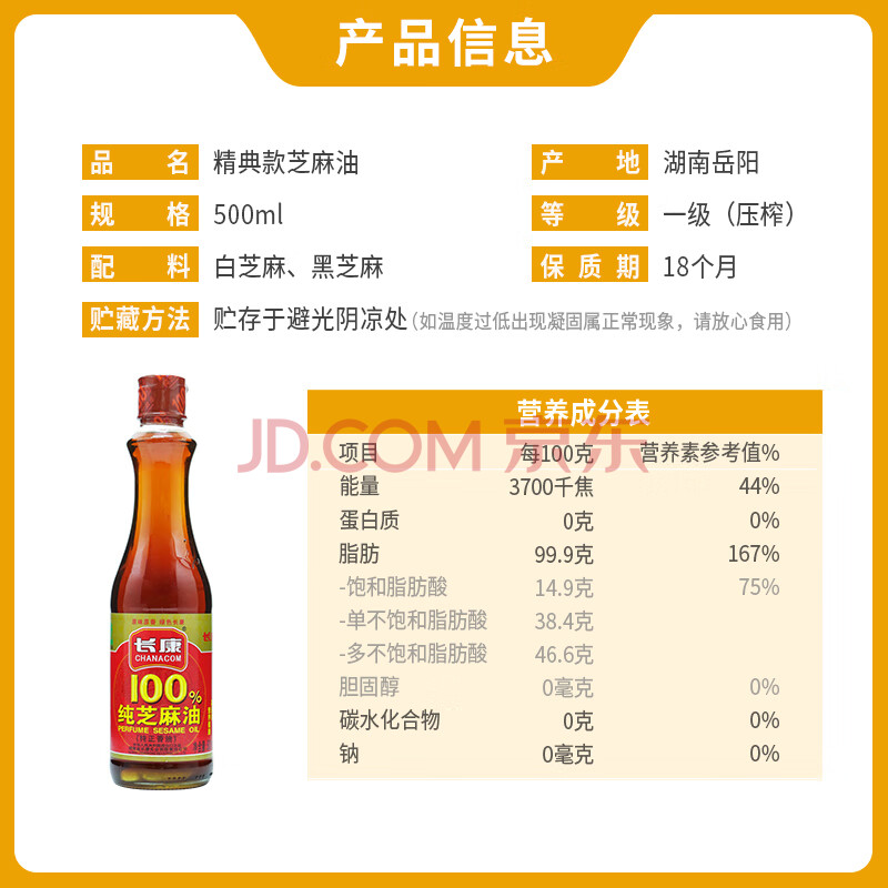 商品相册:长康 芝麻香油 纯芝麻油500ml 凉拌火锅调味品 一级压榨第