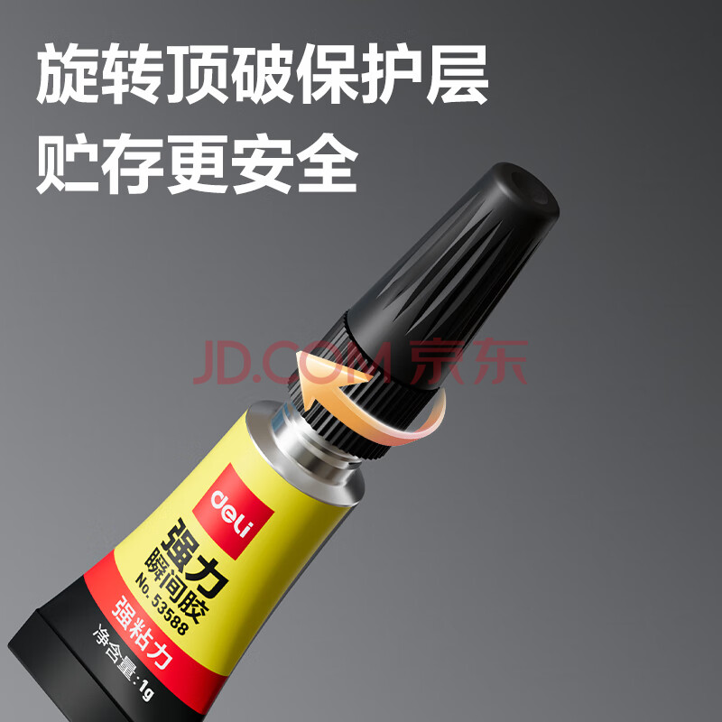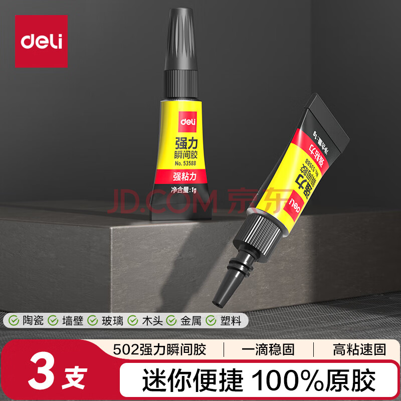 商品相册:得力(deli)502胶水 瞬间胶强力胶 准确点胶 无痕胶透明胶粘剂 可粘金属陶瓷木材 1g*3支便携装 53588第