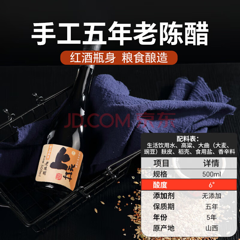 商品相册:上水井 老陈醋 手工五年6度酸零添加山西拌面老陈醋调味品 500ml第