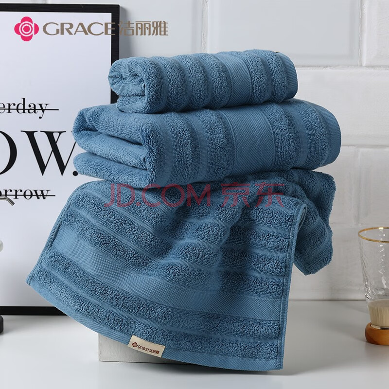 商品相册:洁丽雅(Grace)纯棉毛巾浴巾两件套 A类长绒棉洗脸洗澡柔软吸水速干大面巾 蓝色第