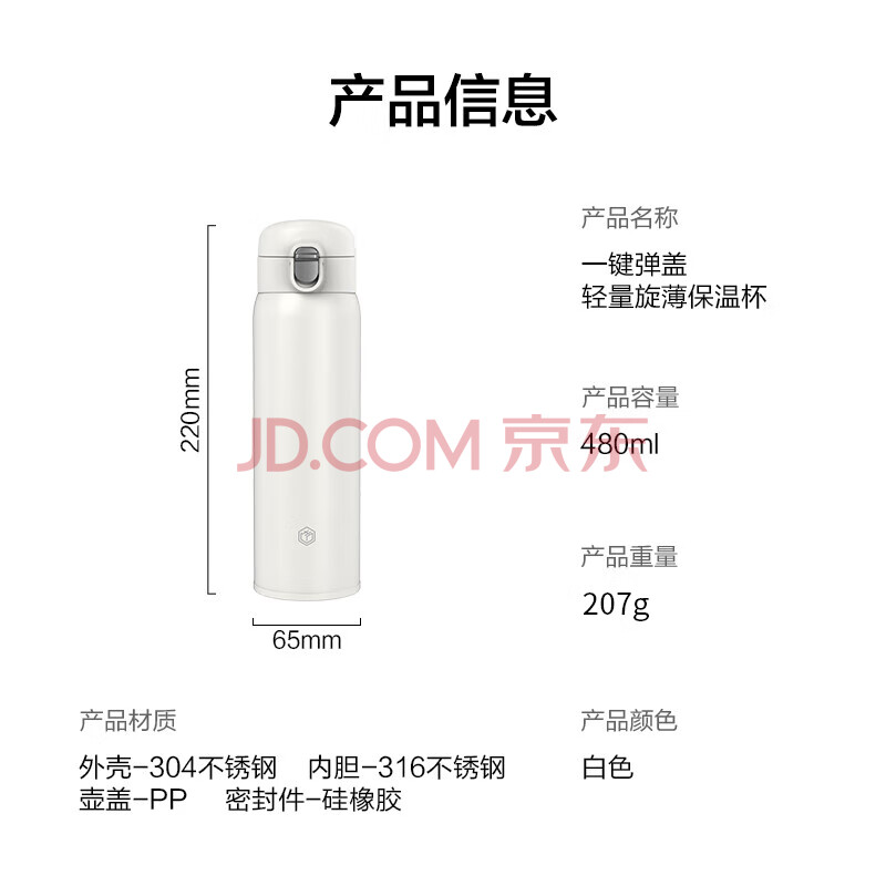 商品相册:京东京造保温杯 水杯子男女儿童学生316不锈钢【一键弹盖】白色480ml第