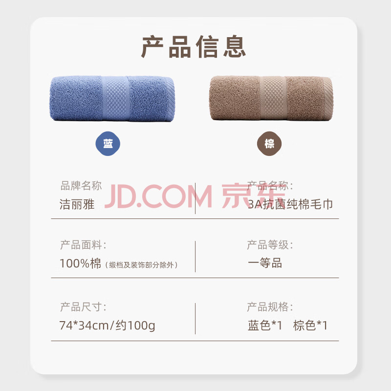 商品相册:洁丽雅(Grace)毛巾 A类抗菌新疆长绒棉强吸水加厚男士女士洗脸毛巾74*34cm 100g第