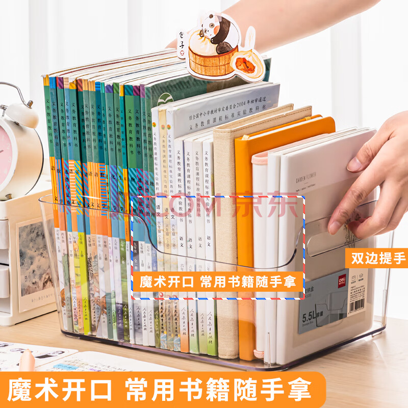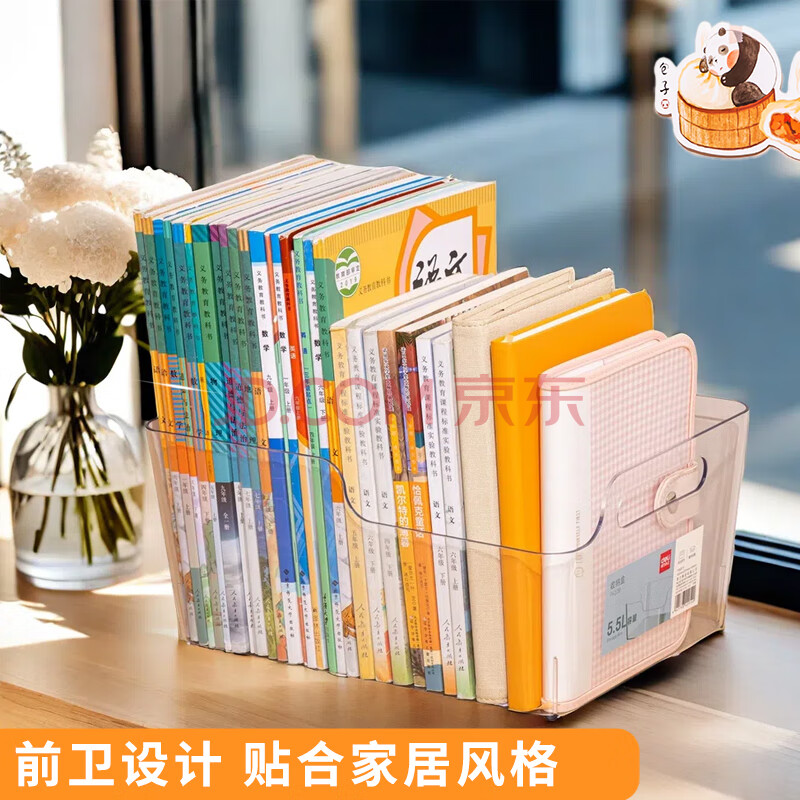 商品相册:得力(deli)亚克力透明大容量加厚书立架桌面书本收纳盒阅读架办公学生书桌整理置物架装书神器PK108第
