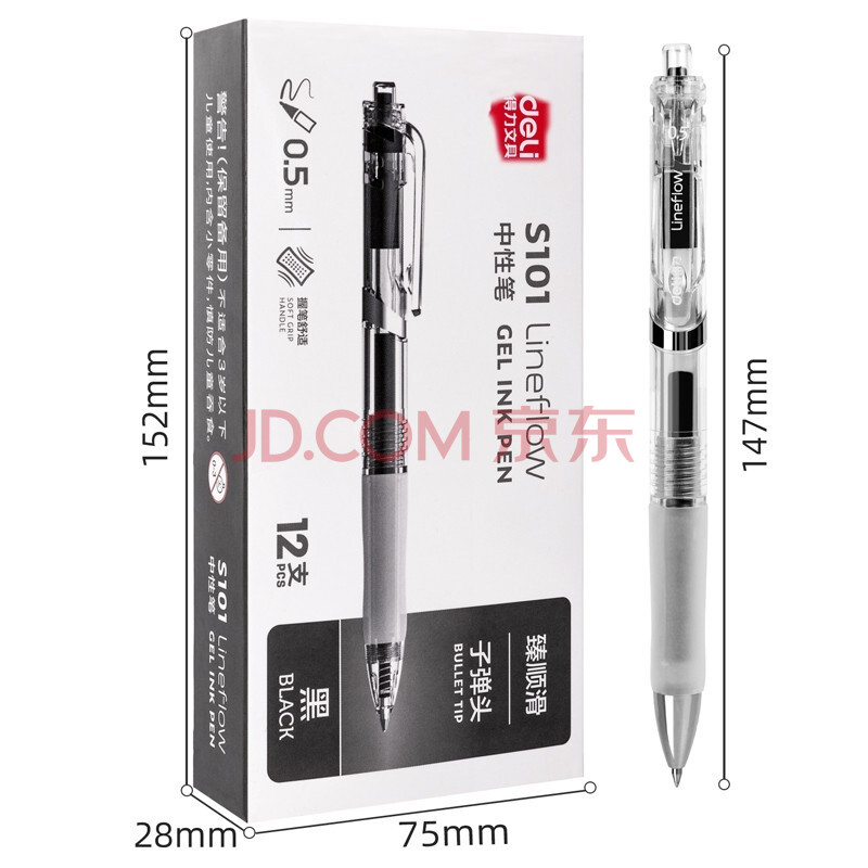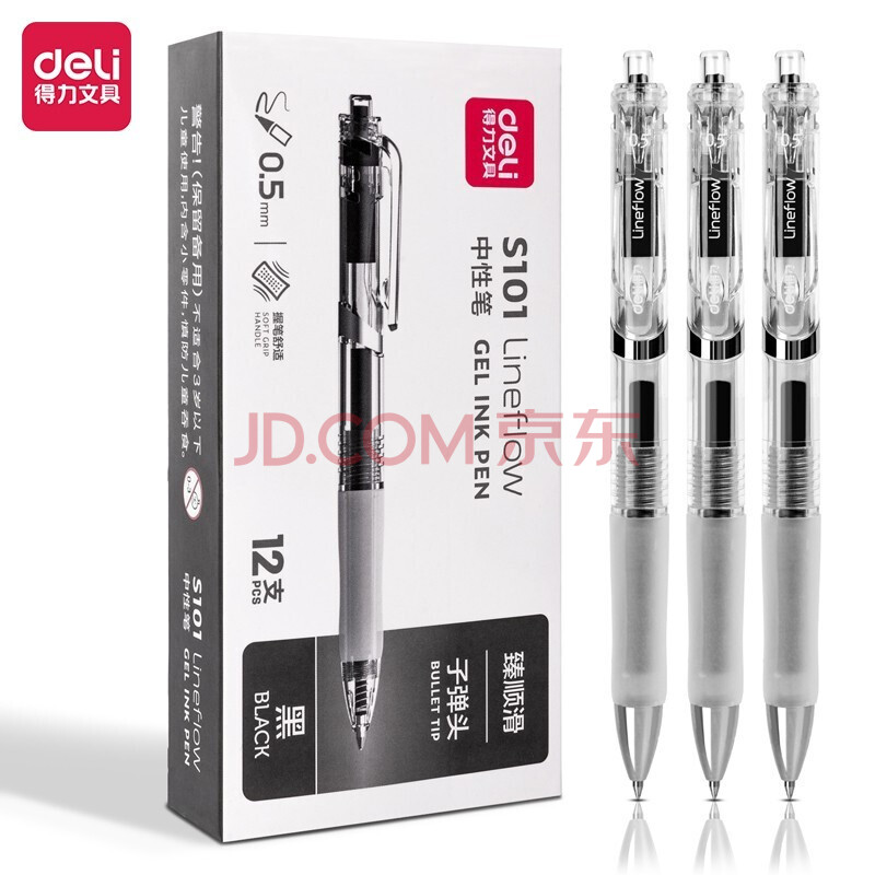 商品相册:得力(deli) 中性笔 0.5mm按动中性笔 无印风签字笔 子弹头 黑色12支/盒 DL-S101第