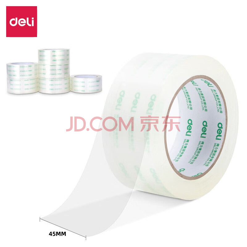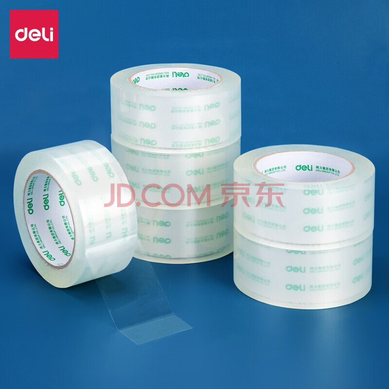 商品相册:得力(deli)透明封箱胶带 快递物流打包胶布30173 45mm*60m*50um 6卷/筒 1筒装第