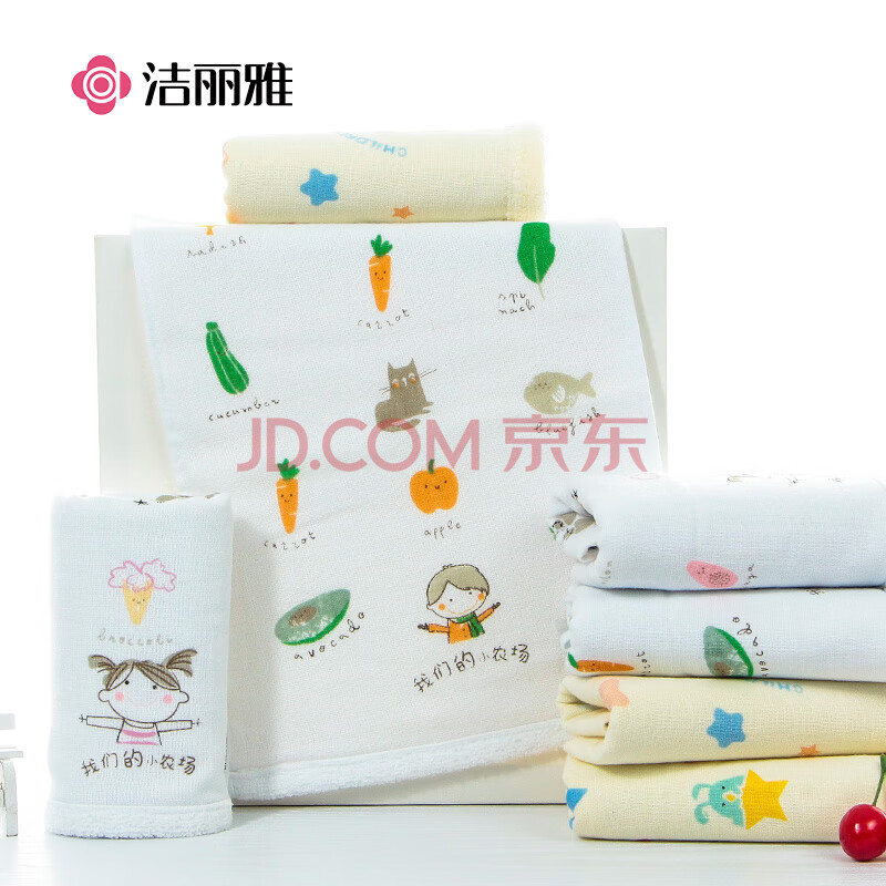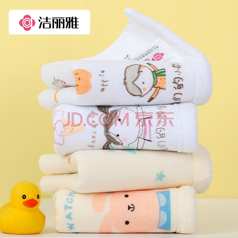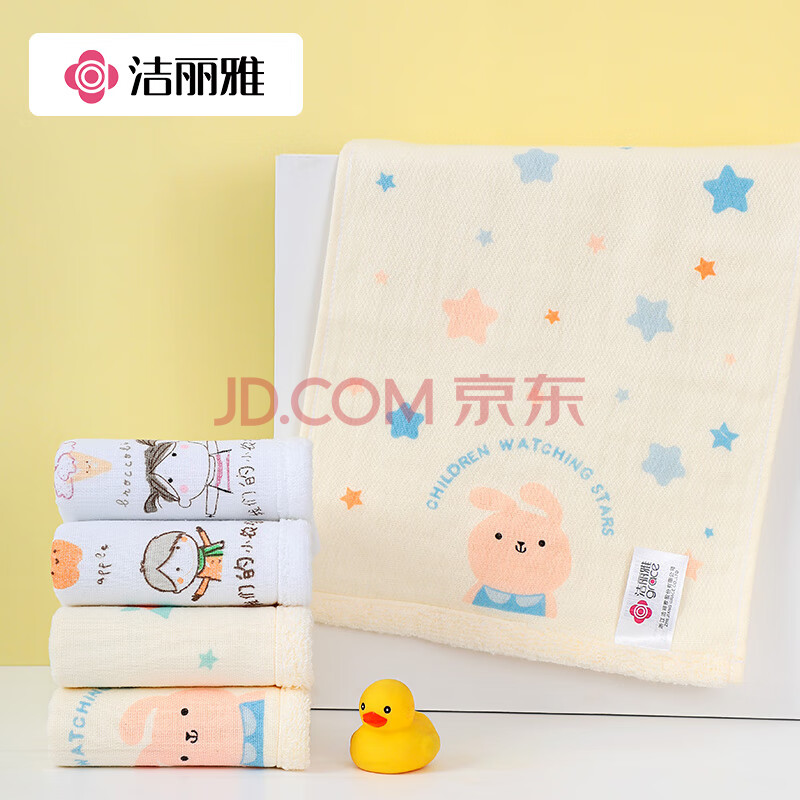 商品相册:洁丽雅卡通印花纯棉A类婴儿童巾洗脸洗澡面巾一面纱布一面毛圈小毛巾4条第
