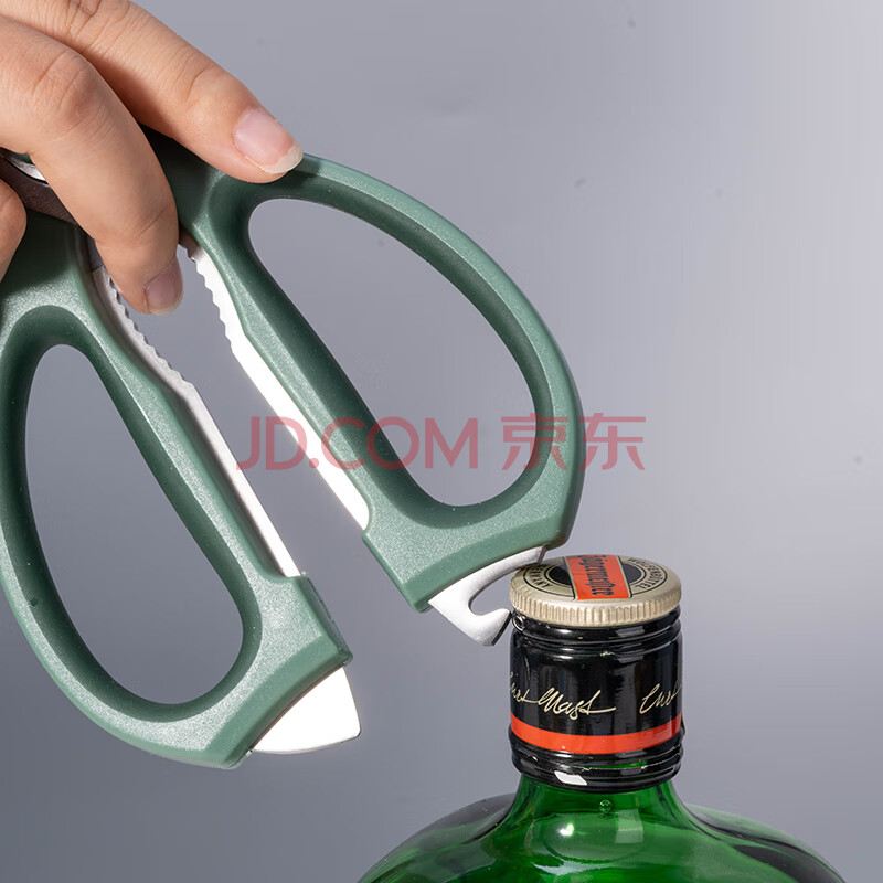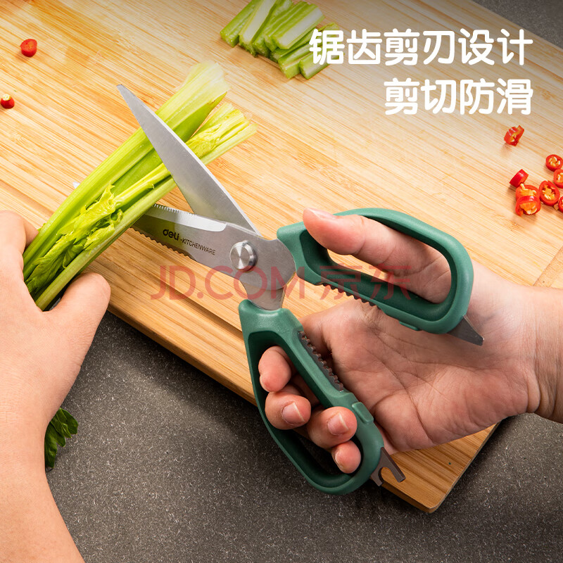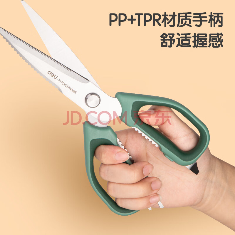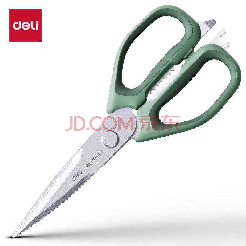 商品相册:得力(deli)食品级厨房剪刀 可夹核桃撬贝壳刮鱼鳞 多功能家用不锈钢剪骨剪子 鸡骨剪 绿 TJ22第