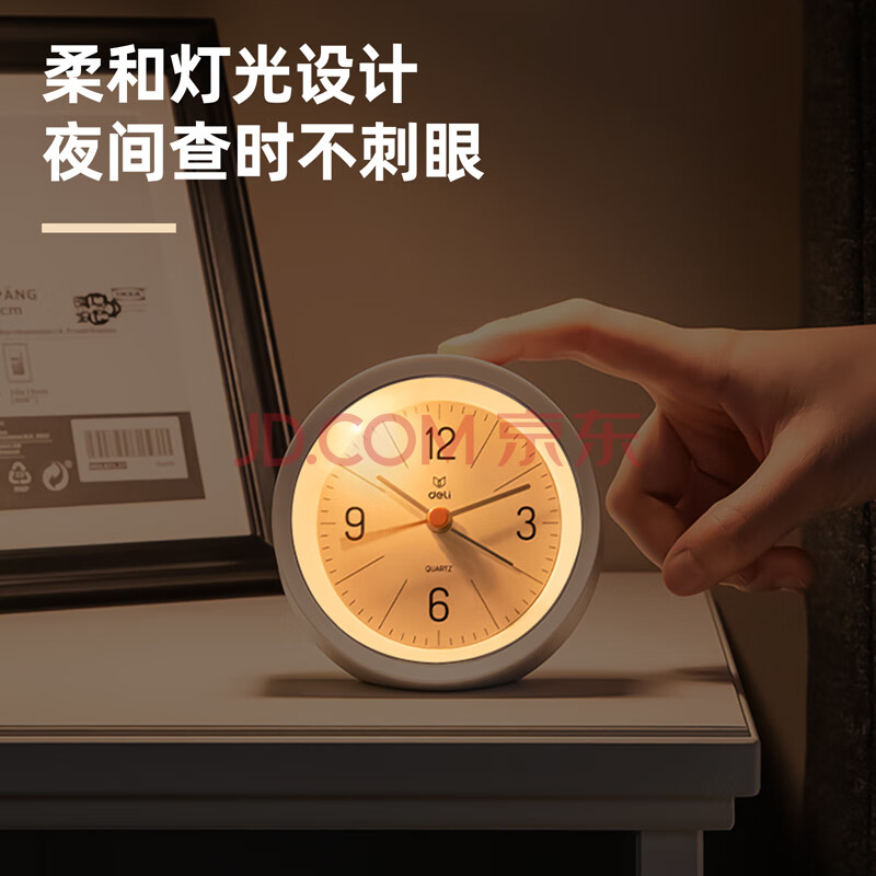 商品相册:得力简约蜂鸣式渐响闹钟时钟 低噪音学生闹钟柔和灯光 家庭办公闹钟 白色LE300-WH开学季第