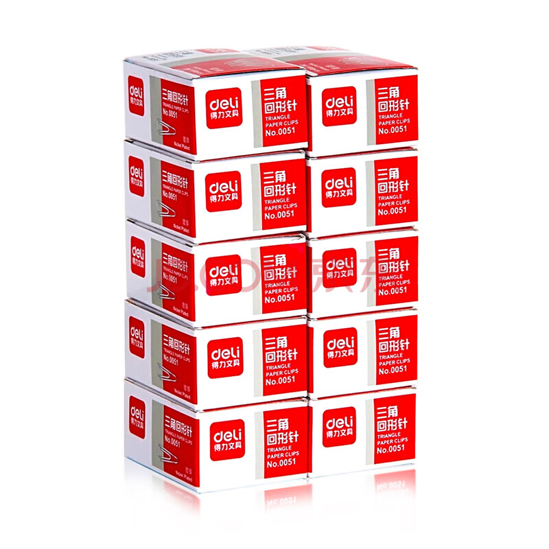 商品相册:得力(deli)0051回形针 3#镀镍三角回形针 29mm金属曲别针 100枚/盒 10盒装【ZY】第