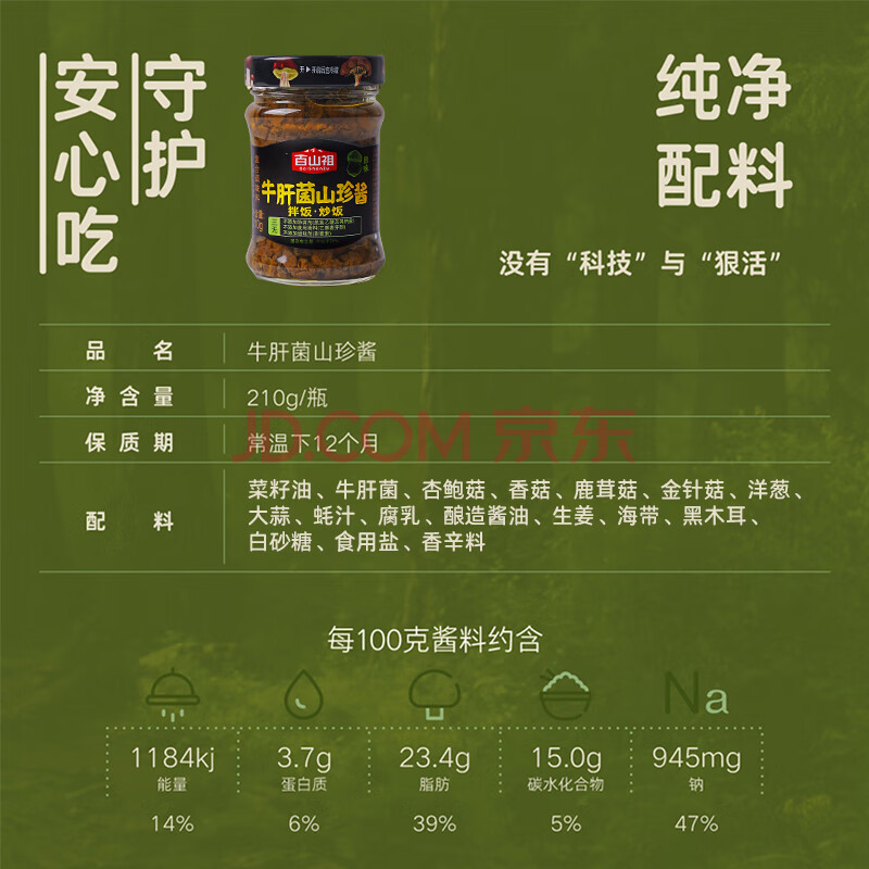 商品相册:百山祖牛肝菌酱原味香菇酱拌面酱拌饭酱下饭菜不辣菇酱调味酱料210g/瓶第