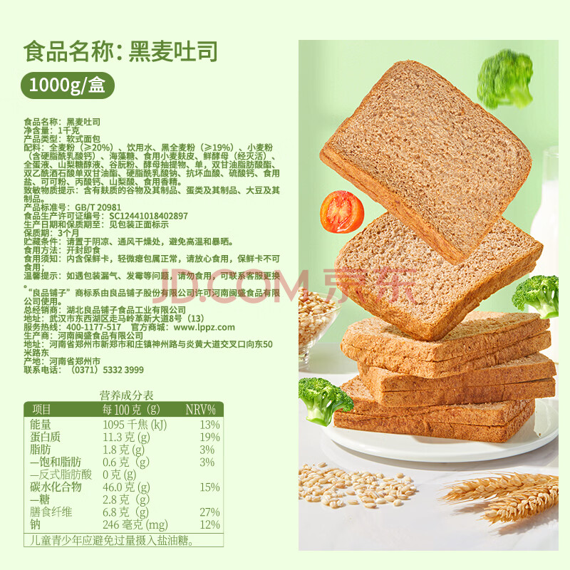 商品相册:良品铺子 黑麦全麦面包1000g/箱早餐面包低脂健身轻食代餐吐司零食第