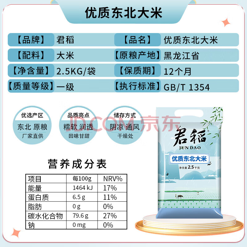 商品相册:君稻东北大米5斤一袋 真空装 珍珠米2.5kg 圆粒粳米 自营第