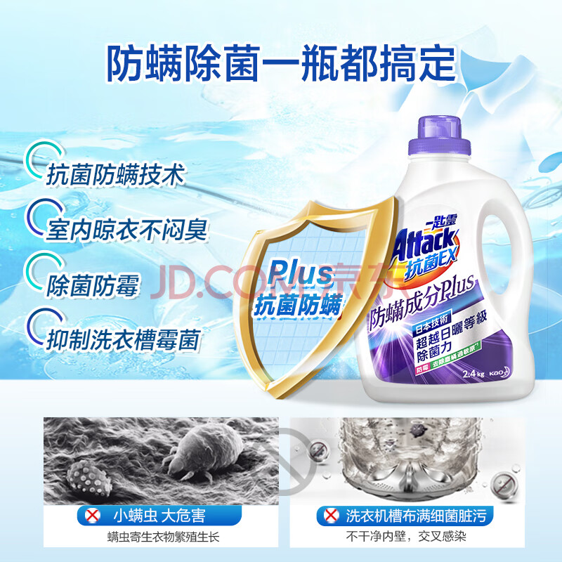 商品相册:花王(KAO)防螨洗衣液2.4kg 抗菌除垢衣物超洁霸防螨除菌浓持久留香缩洗衣精第