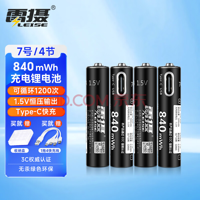 商品相册:雷摄(LEISE)充电电池 7号/Type-C充电锂电池840mWh(4节)盒装 1.5V恒压大容量 适用:玩具/无线鼠标/遥控器等第