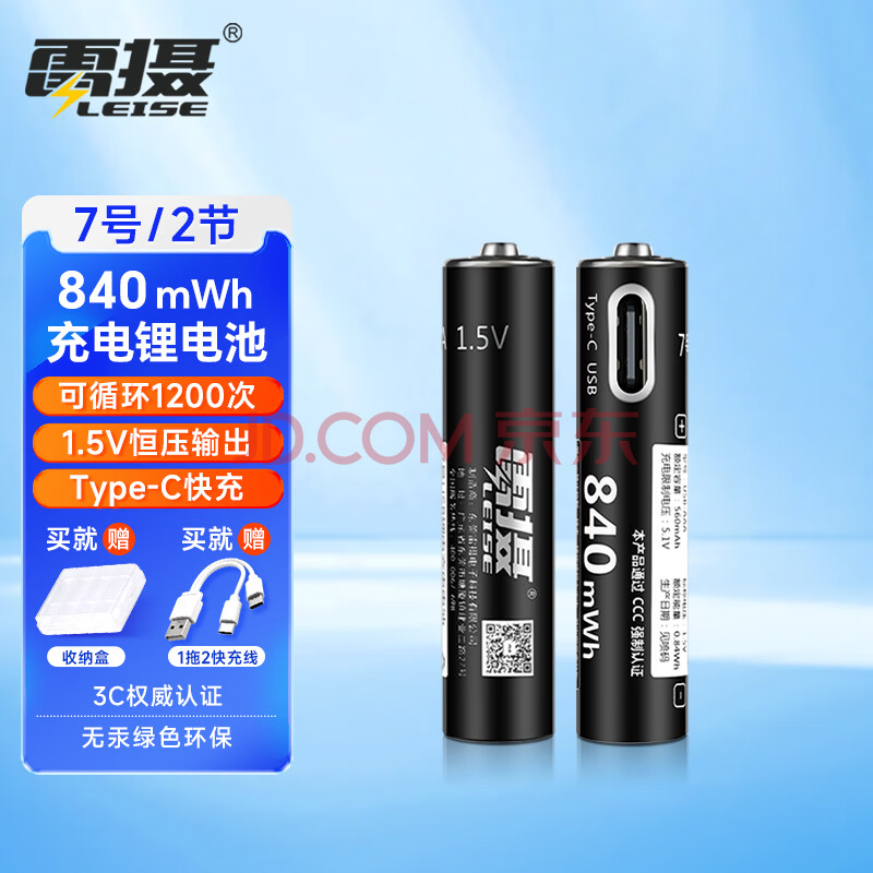 商品相册:雷摄(LEISE)充电电池 7号/Type-C充电锂电池840mWh(2节)装 1.5V恒压大容量 适用:玩具/无线鼠标/游戏手柄等第