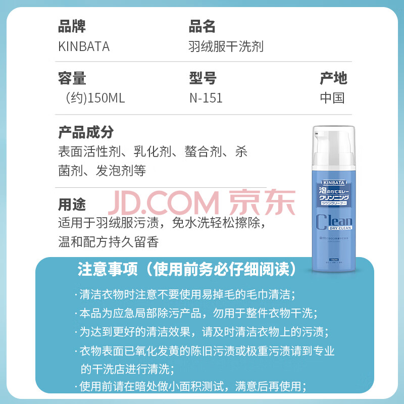 商品相册:KINBATA日本羽绒服清洗剂150ml*2瓶干洗剂顽固污渍去油渍免水洗强力去污第