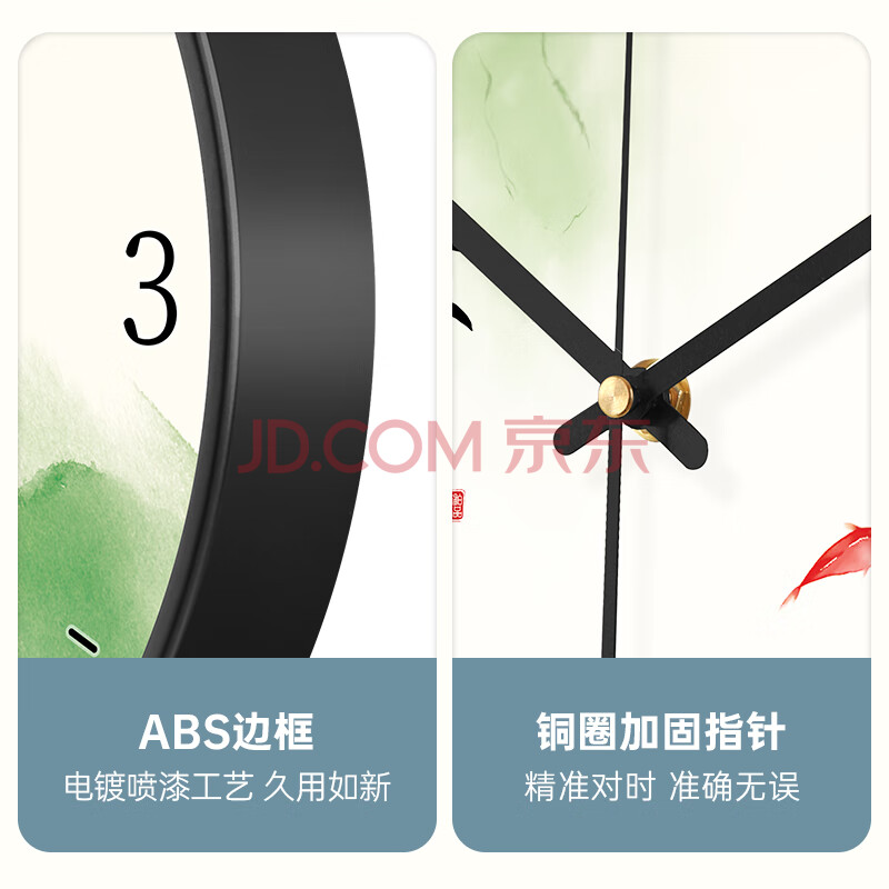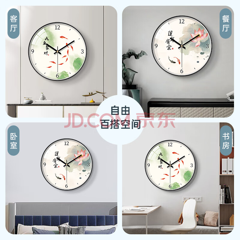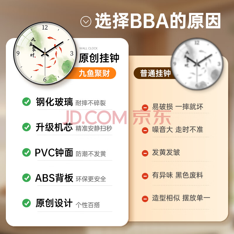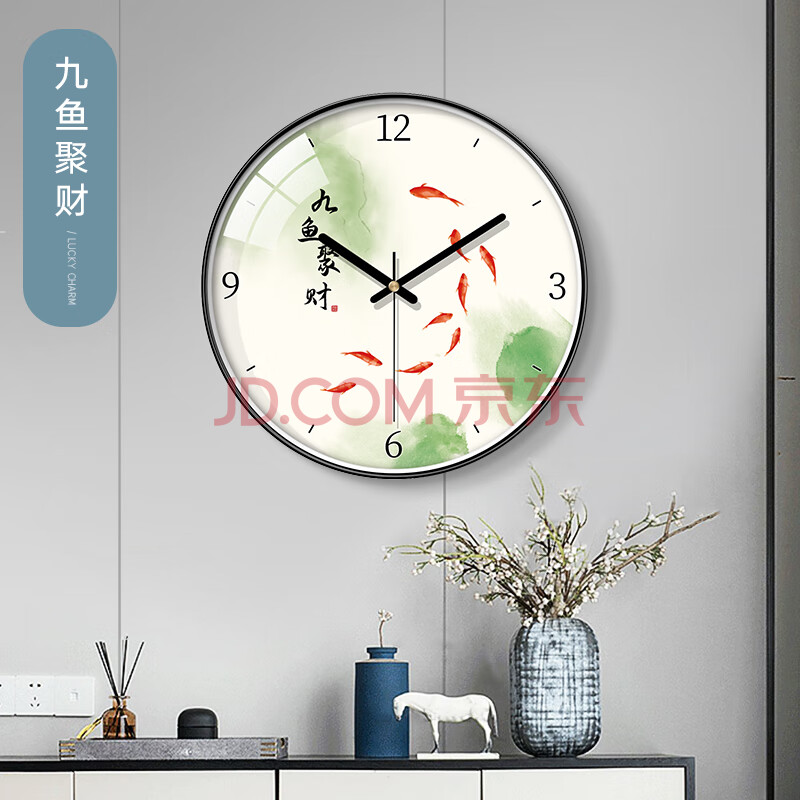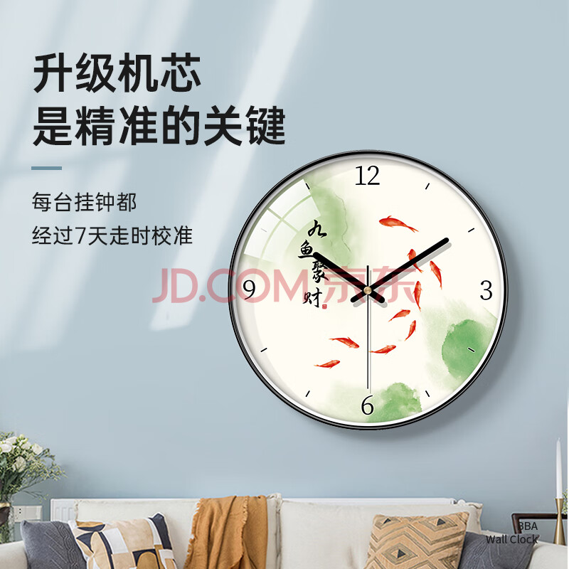 商品相册:BBA 挂钟客厅家用创意新中国风挂表时钟免打孔石英钟 九鱼聚财30cm第