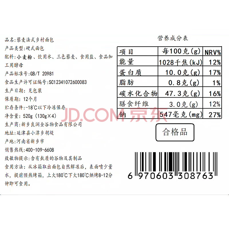 商品相册:吾双面包法式乡村藜麦面包520g 4个装 冷冻法棍烤即食轻食杂粮第