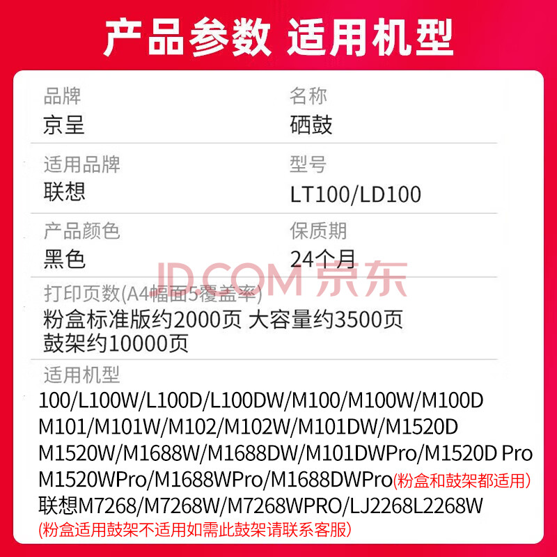 商品相册:京呈LT100/LD100适用联想M100w/d墨粉M102w粉盒M101W硒鼓M101DW M1520w墨粉盒领像M1688dW pro打印机墨盒 大容量第