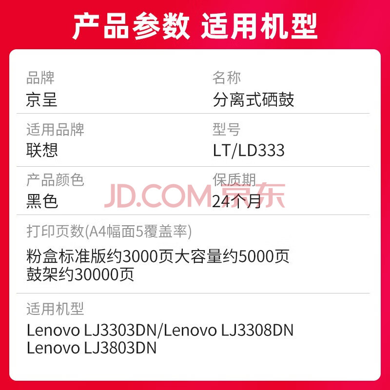 商品相册:京呈LT333粉盒适用联想Lenovo LD333硒鼓LJ3303DN/LJ3803DN/LJ3308DN打印机墨盒碳粉盒硒鼓 标准容量3000页第