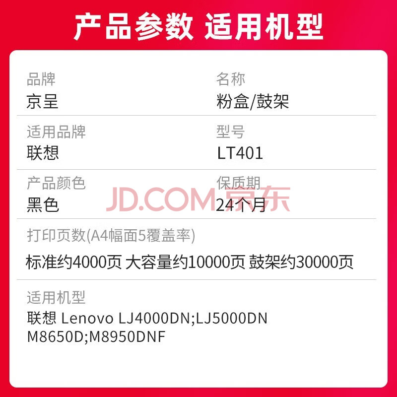 商品相册:京呈LT401墨粉盒LD401鼓架适用联想lenovo打印机LJ4000D/LJ4000DN/LJ5000DN/M8650DN/M8950DN M8950DNFF硒鼓墨盒第