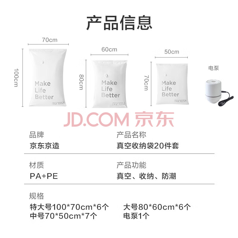 商品相册:京东京造 真空收纳袋 搬家打包袋压缩袋被子衣服衣物20件【电泵款】第