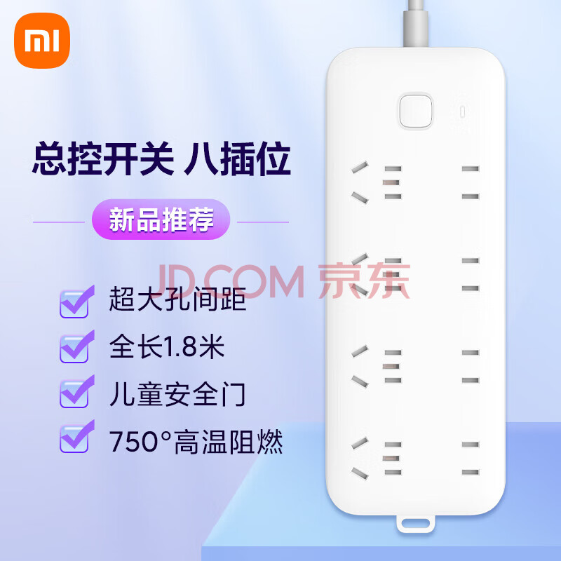 商品相册:小米(MI)插线板8位总控开关插排插座插板一转多插座全长1.8m适用小米17小米电暖器/热水器/电热毯第