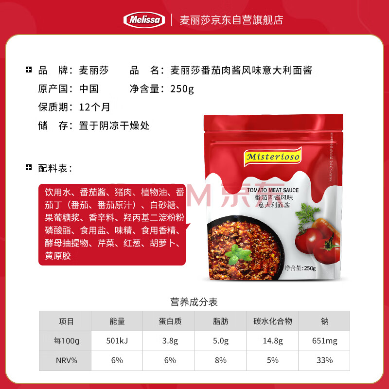 商品相册:麦丽莎(Melissa)意大利风味番茄肉酱意面酱意大利酱250g*2袋 意粉速食调味拌面酱第