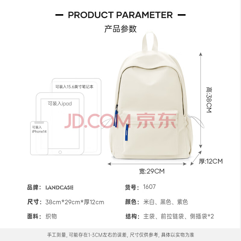 商品相册:Landcase 书包初高中生大学生校园背包轻便减负大容量双肩包 1607白色第