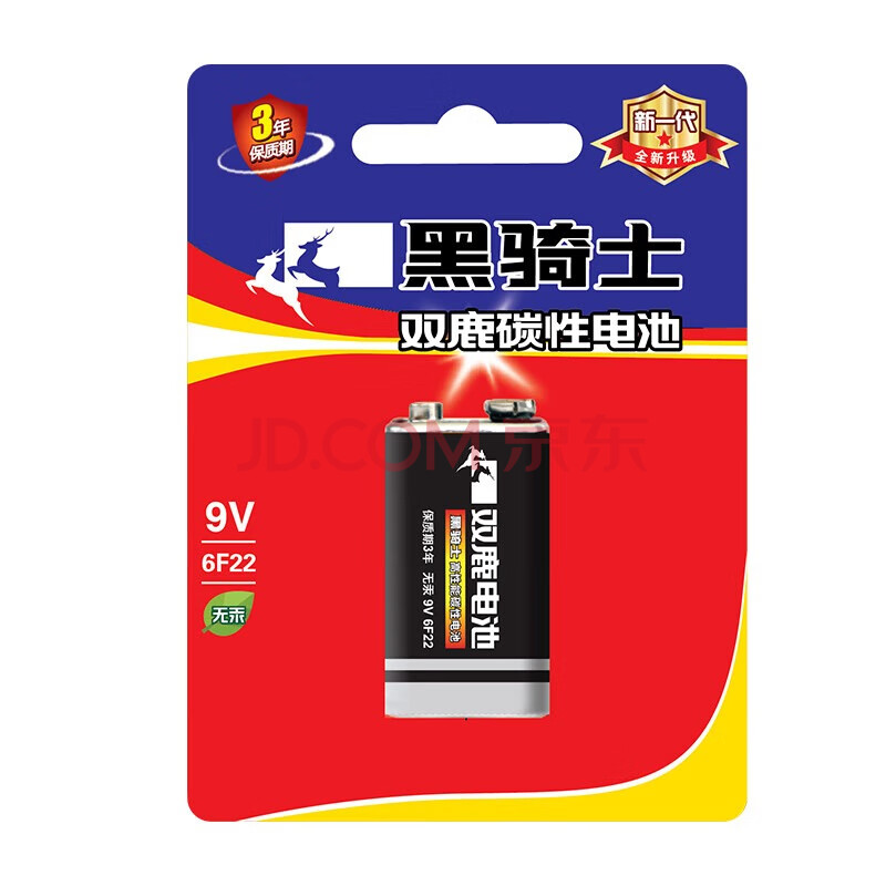 商品相册:双鹿 黑骑士9V碳性电池1粒卡装 适用于万用表/烟雾探测器/玩具遥控器/话筒 6F22/叠层电池 1粒卡装第