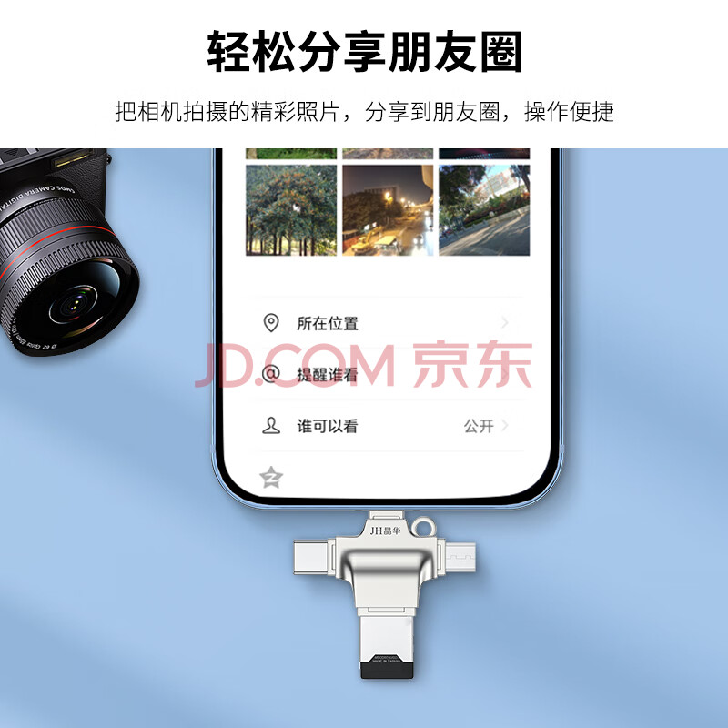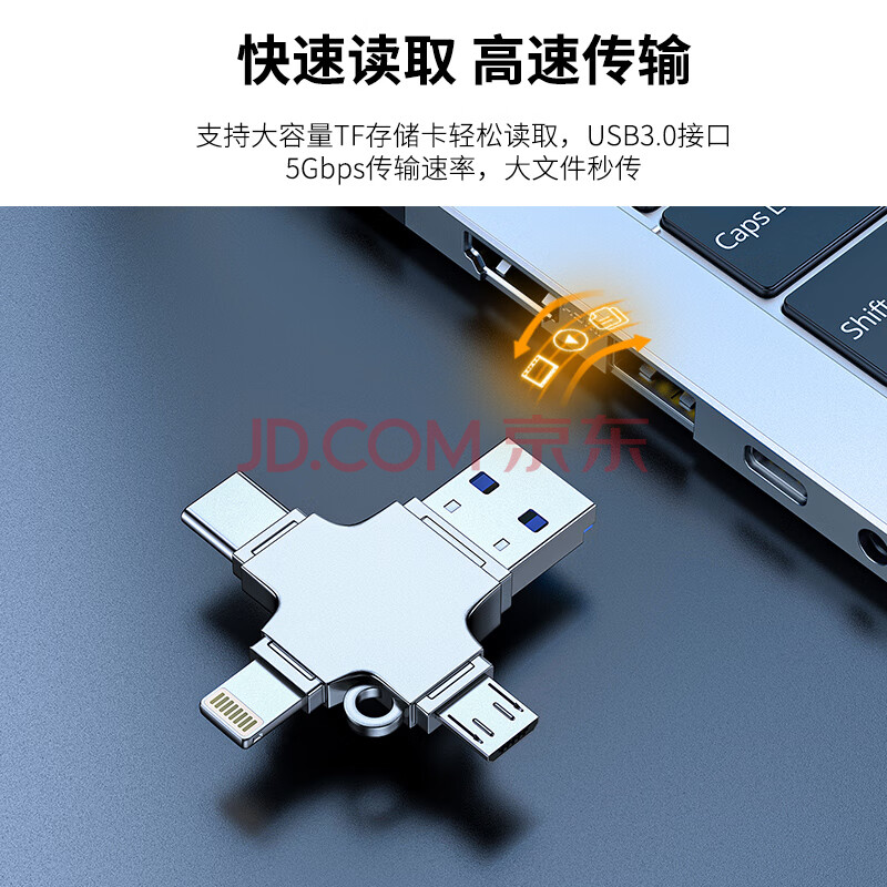 商品相册:晶华(JH)苹果Type-C安卓读卡器四合一多功能 Micro SD/TF笔记本手机电脑平板单反相机存储内存卡 银色 D509第