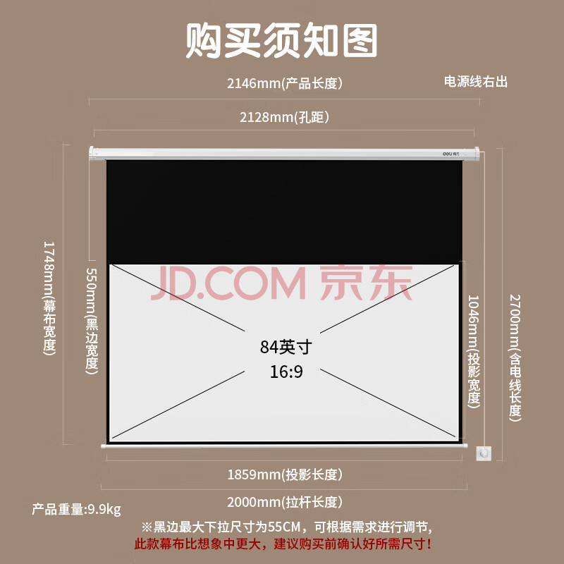 商品相册:得力(deli)84英寸16:9遥控电动投影幕布加长黑边(配备遥控器 投影布简易家用投影机投影仪幕布)第